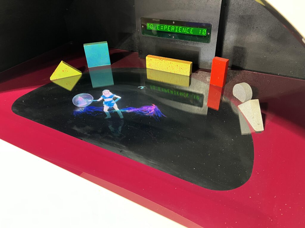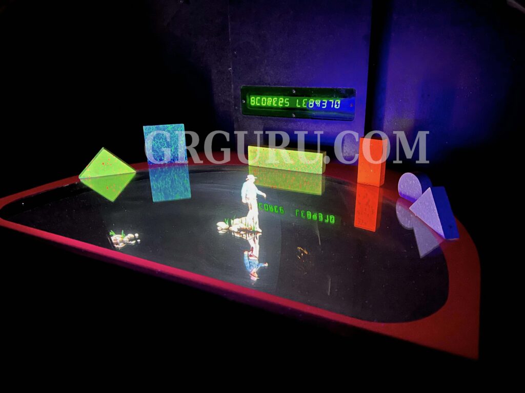 Time Traveler is notable for being the first “holographic video game”, caused by an optical illusion involving a CRT television set and a large curved mirror. It causes the characters to appear free-standing on a semicircular black platform (dubbed the “micro theatre”).